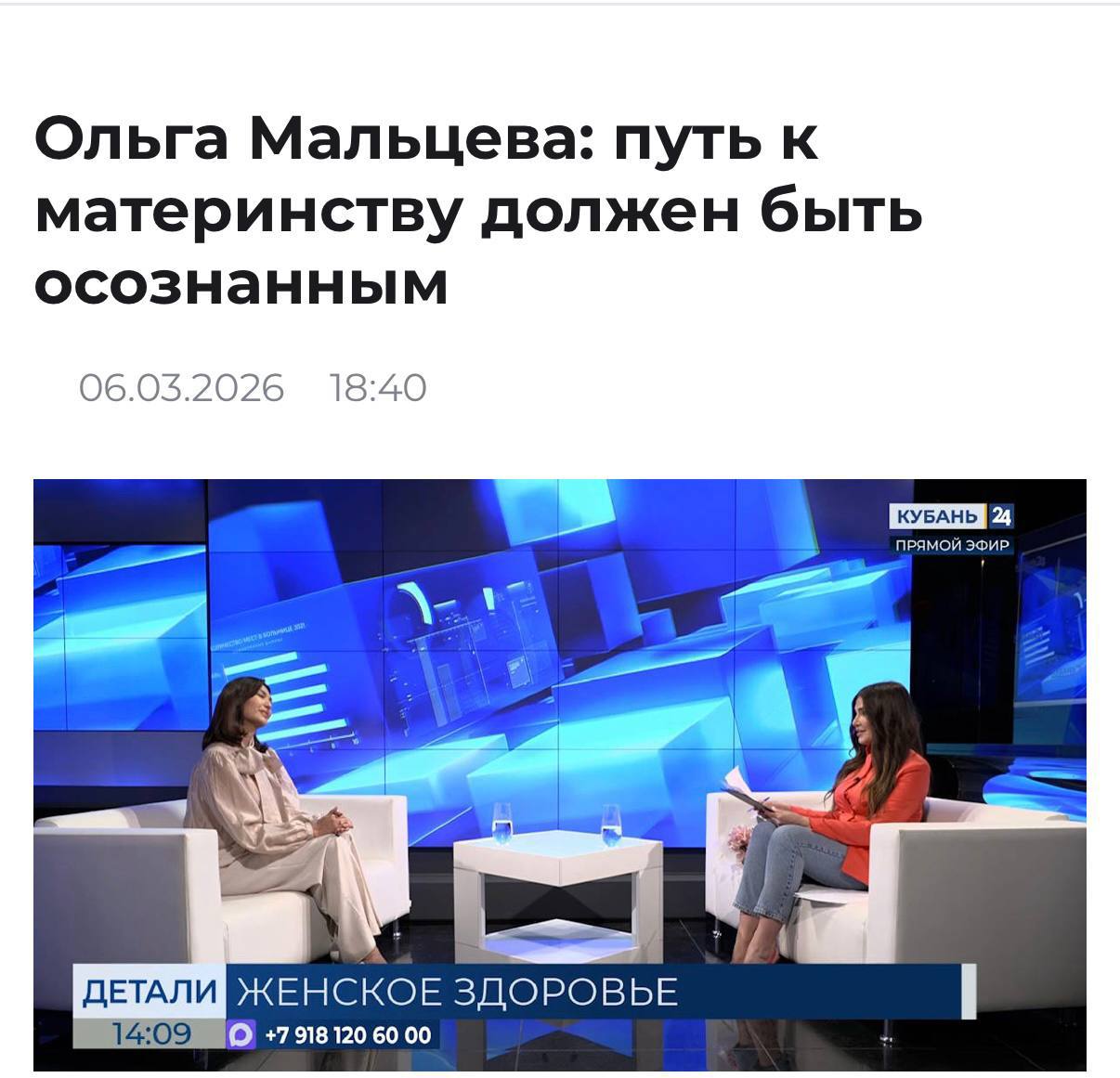 Врач акушер-гинеколог Перинатального центра Краснодарской краевой клинической больницы Nº2 Ольга Мальцева в эфире телеканала «Кубань 24» рассказала о важности гинекологической диспансеризации и осознанного планирования материнства.